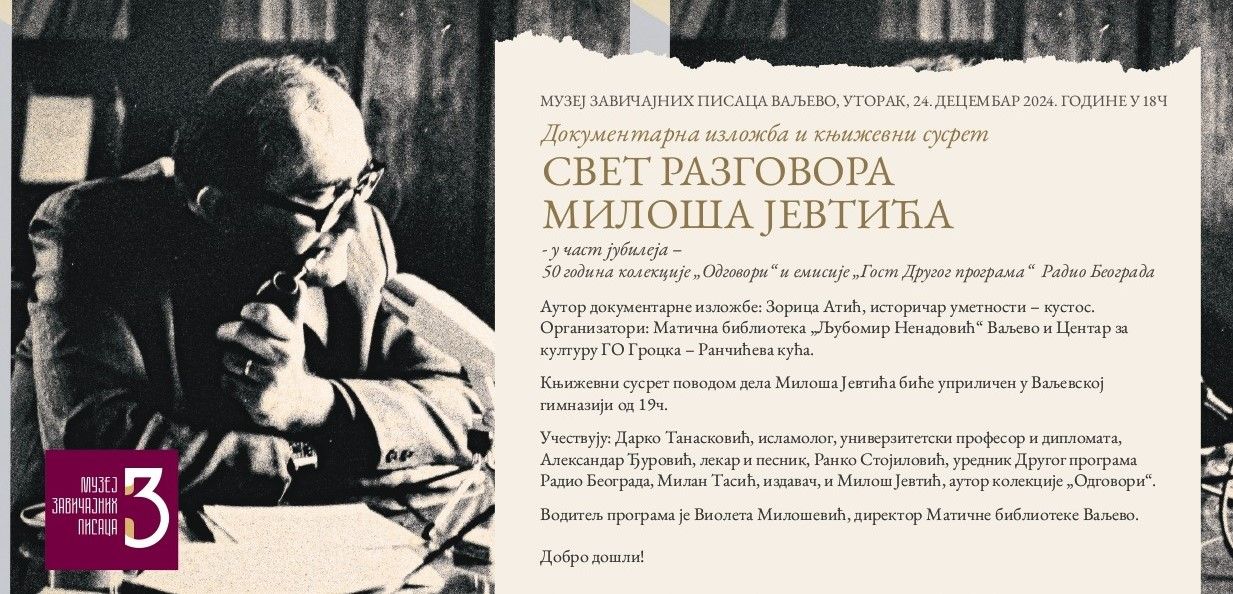 У МУЗЕЈУ завичајних писаца, у матичној библиотеци „Љубомир Ненадовић“ у граду на Колубари, приређена је документарна изложба „Свет разговора Милоша Јевтића“. Ова колекција је постала незаобилазни извор података за истраживаче, а чини је невероватних 235 досад објављених књига, односно читав чудесни свет разговора, пријатељстава и људовања. Поставку су уприличили Центар за културу општине Гроцка - Ранчићева кућа и Матична библиотека "Љубомир Ненадовић" у Ваљеву, са идејом да обиђе бројне градове Србије.